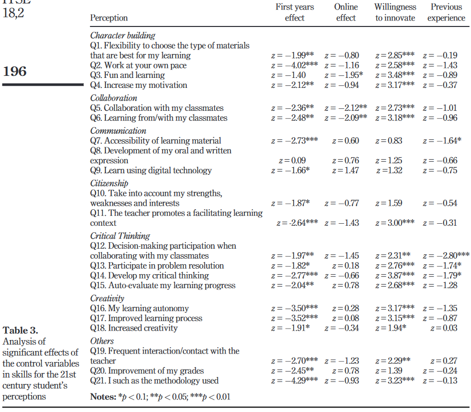 Using inverted sessions, the 21st century skills needed (creativity, critical thinking, communication and collaborative skills, citizen competence, & development of character) is facilitated further. The study also proved that these are applicable regardless of educational level so this can also help professionals to continue to develop such skills.